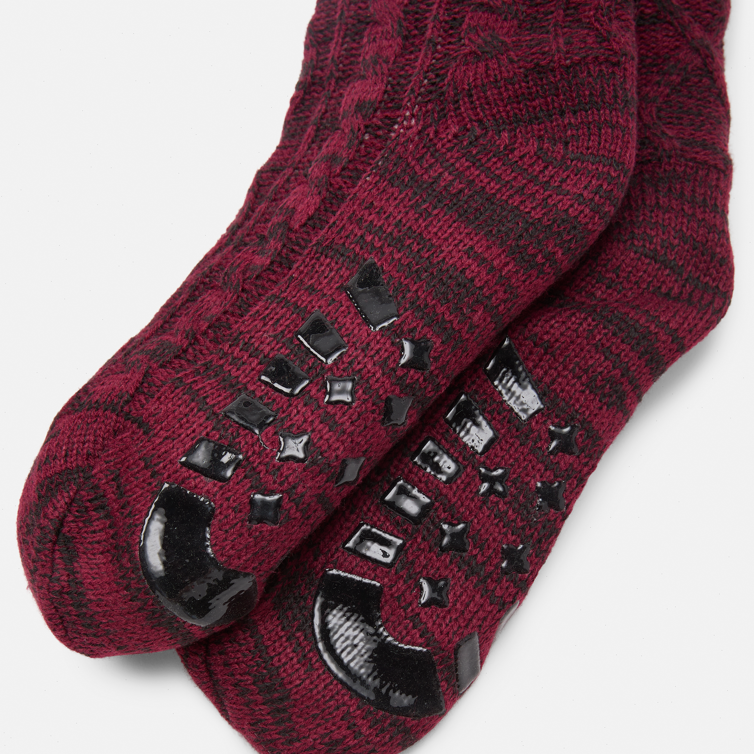 These women's cabin socks of cozy 65% acrylic, 33% polyester, and 2% elastane knit feature high-pile fleece linings and slip-resistant silicone grips, helping combine warmth and safety in a giftable design.