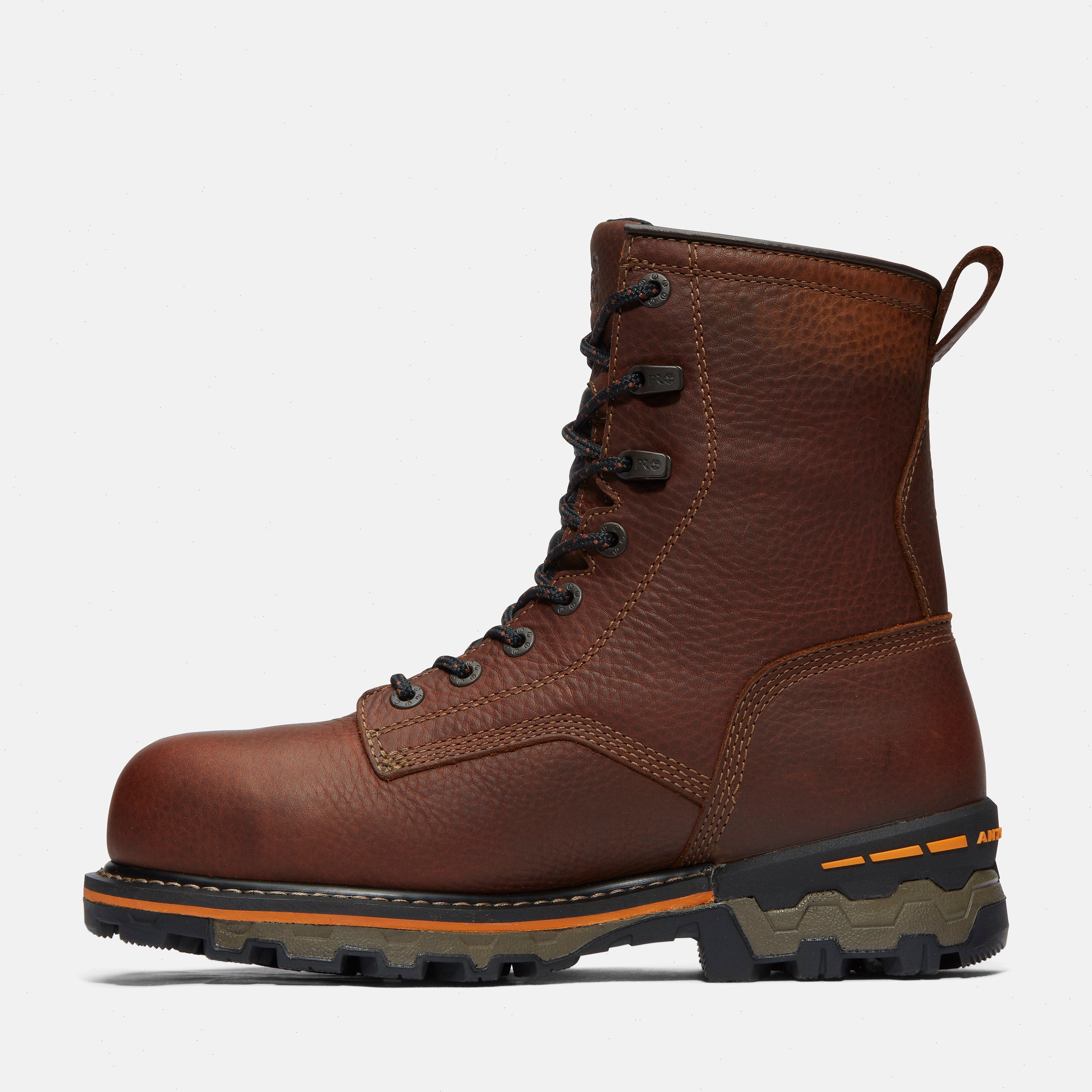 We designed our heavy-duty Boondock manufacturing boots to provide industrial-grade protection from every angle. Starting with their premium Timberland® waterproof leather uppers with internal waterproof, breathable membranes for maximum waterproof protection and resistance to blood-borne pathogens, we added composite safety toes, electrical hazard protection, rigid external heel cups to support lateral movement, and our Anti-Fatigue Technology footbeds for all-day shock absorption and energy return. You'll also find protection from below with our heat-, slip-, oil, and abrasion-resistant, non-marking, lightweight, All-Weather TPU outsoles that offer enhanced traction in extreme environments. Plus, their breathable, moisture-wicking linings are made of ReBOTL™ fabric containing at least 50% recycled plastic with an antimicrobial treatment for odor control.